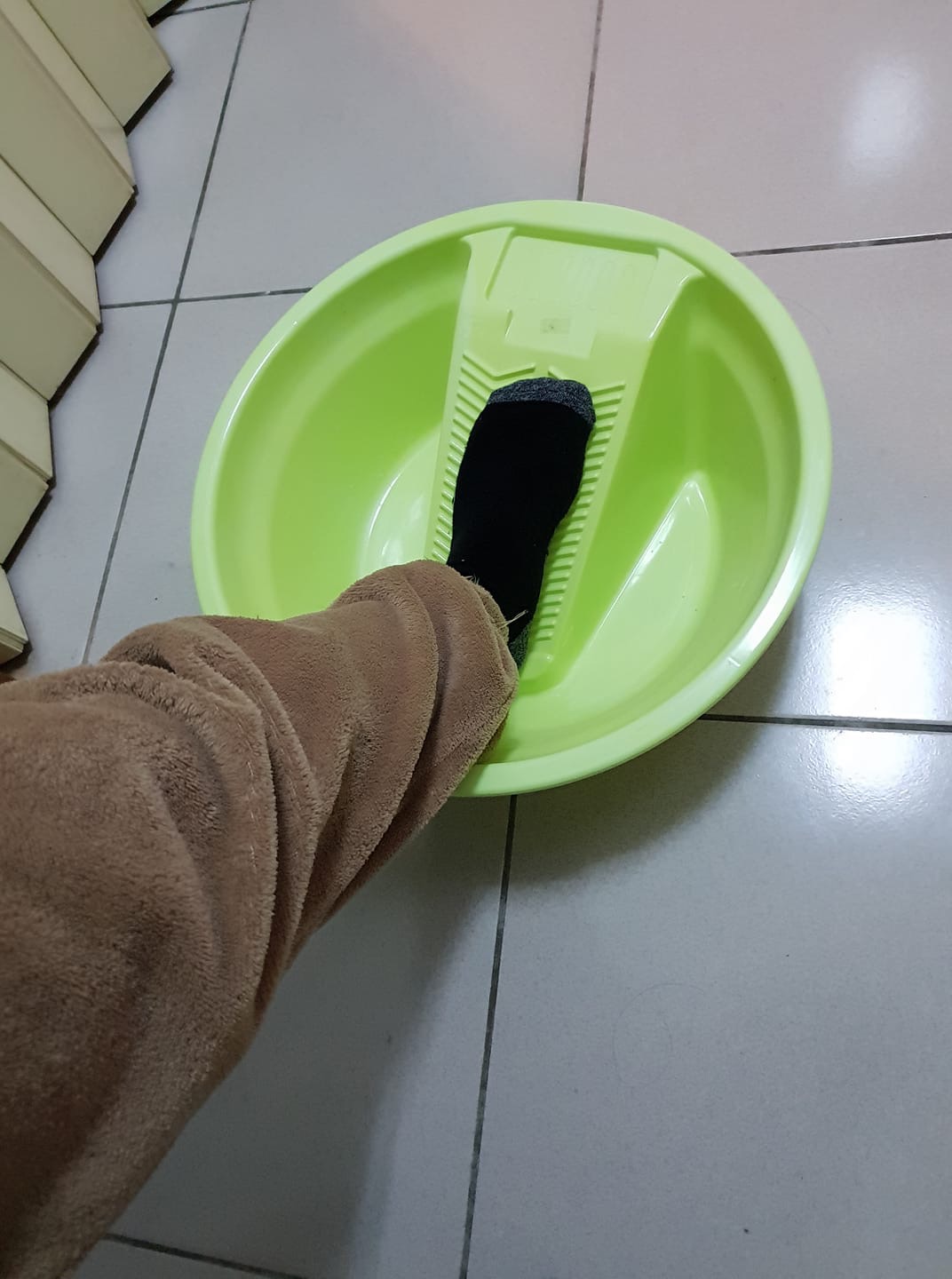 我看到廁所有一個洗衣板,靈機一動拿來試用,發現有效降低患腳的不適,因為它可以讓我的腳呈現最自然的方式靠著。