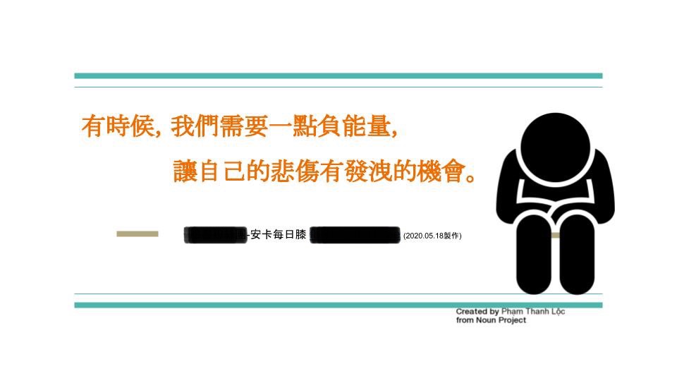 安卡以前會覺得要思想正向,逼自己趕快擺脫負面情緒,逼自己趕快好起來,但有時候,我們需要一點負能量,讓自己的悲傷有發洩的機會。