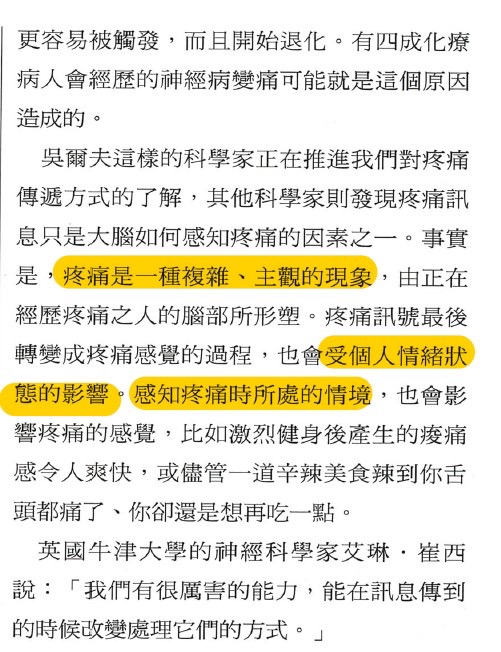 4.疼痛會受到環境及情緒影響,當你恐懼、焦慮或悲傷會使疼痛感更加嚴重。