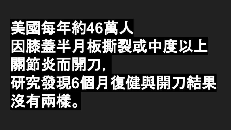 結果,發現其中396個是無效的,英語稱「Medical Reversal(醫療逆轉)」。#美國每年約46萬人因膝蓋半月板撕裂或中度以上關節炎而開刀,#研究發現6個月復健與開刀結果沒有兩樣。