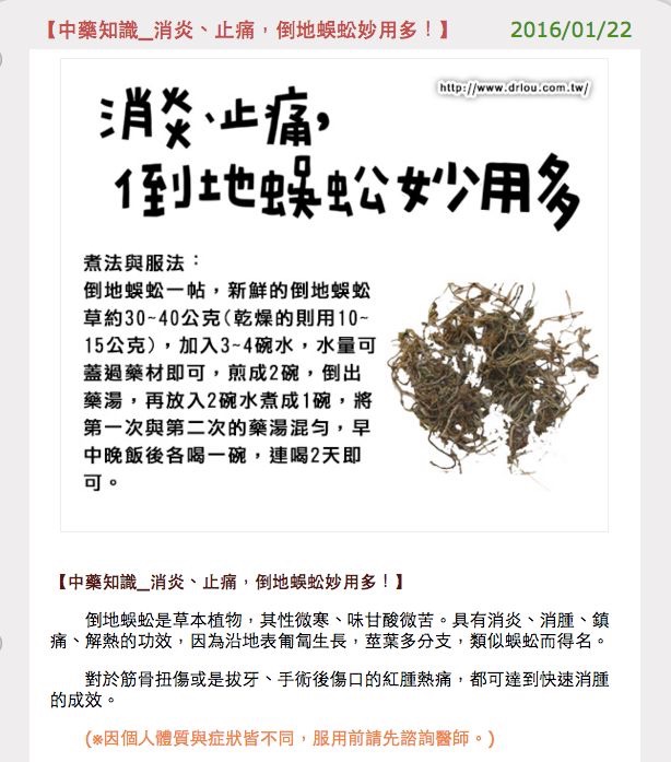 延伸閱讀【中藥知識_消炎、止痛,倒地蜈蚣妙用多!】 圖截圖自該網站