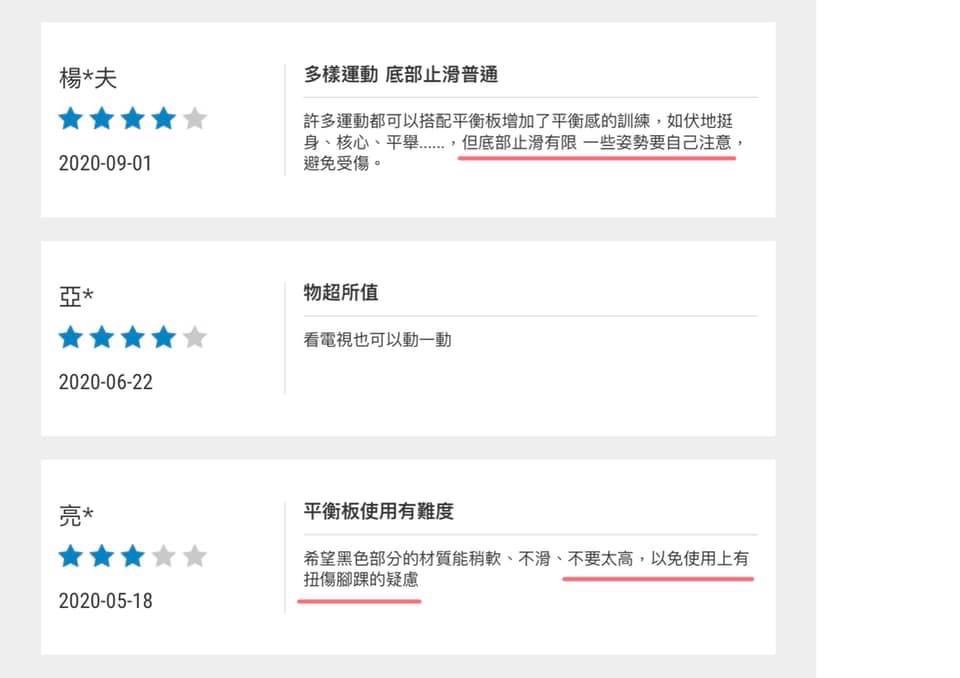 安卡去運動用品店迪XX時,發現也有賣平衡板,但體驗過後發現這款商品存在設計缺陷,底座做太窄,所以傾斜角度大,一旦沒站好倒地時會覺得腳踝要扭到了,去看了網友的評價,也有人跟我一樣的感覺(如下圖)。