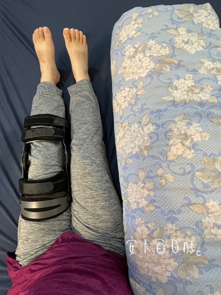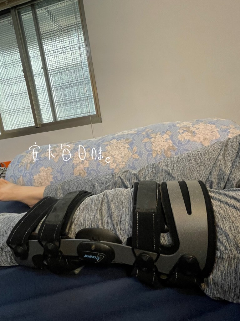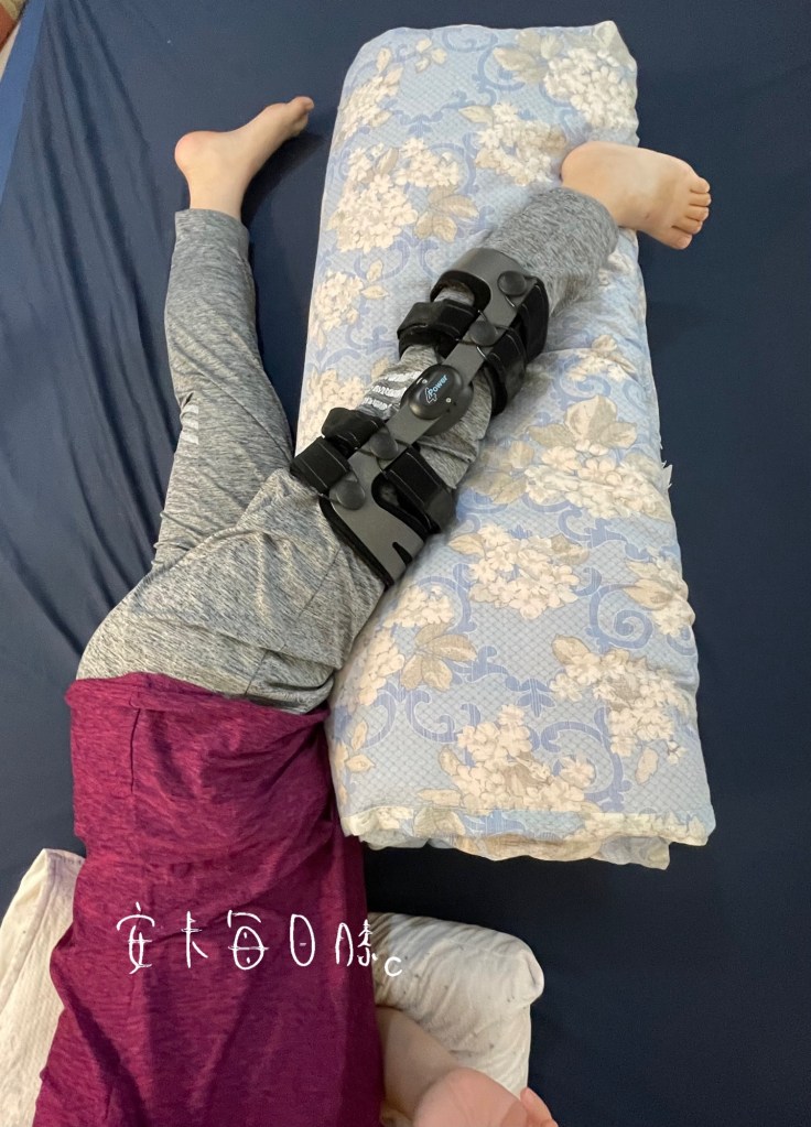 膝蓋做完手術後因為膝蓋疼痛及膝支架固定0度的關係,睡覺只能平躺,但平躺時間長了之後,尾椎就會因為壓迫太久開始不舒服,這是安卡研究出來最舒服的睡姿(如圖),不會讓膝蓋痛,也不會影響膝支架。